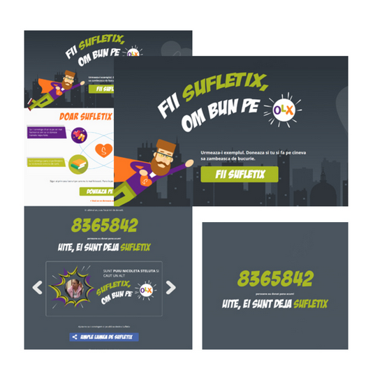 Asa am creat un personaj cu care ne putem identifica cu totii, Sufletix - Om bun pe OLX. Acest personaj are abilitati de super erou si le foloseste pentru a face lucruri bune pentru persoanele in nevoie. Personalitatea lui are multe in comun cu oamenii reali. Puterile lui Sufletix provin din vointa lui de a face lucruri bune prin donare.